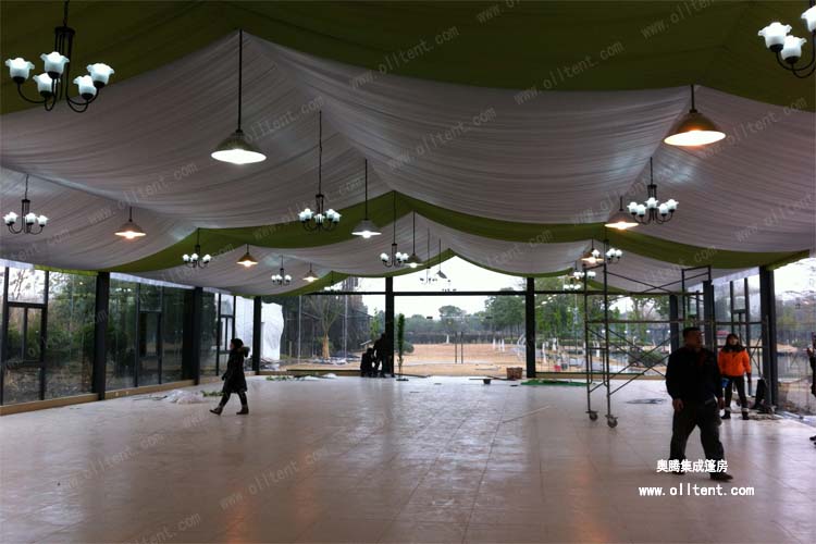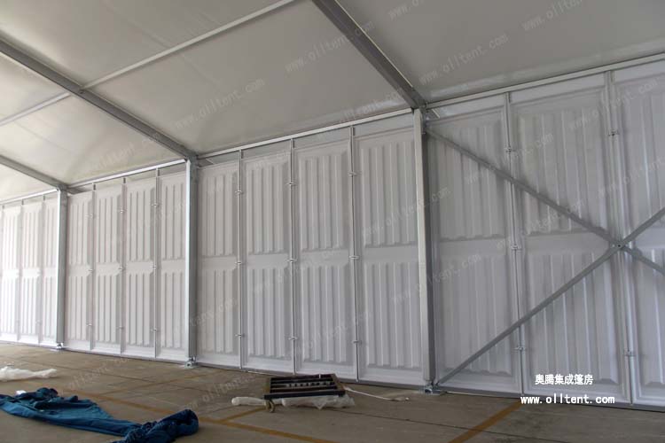 大型篷房還有多種可供選購(gòu)的配置,使篷房的用途和功能更加強(qiáng)大。例如:ABS墻體、三明治墻體、彩鋼瓦墻體、玻璃幕墻、透明頂、頂幔布幔內(nèi)飾、排風(fēng)扇、卷簾門(mén)、玻璃門(mén)、承重盤(pán)承重框、地板系統(tǒng)、排水槽等